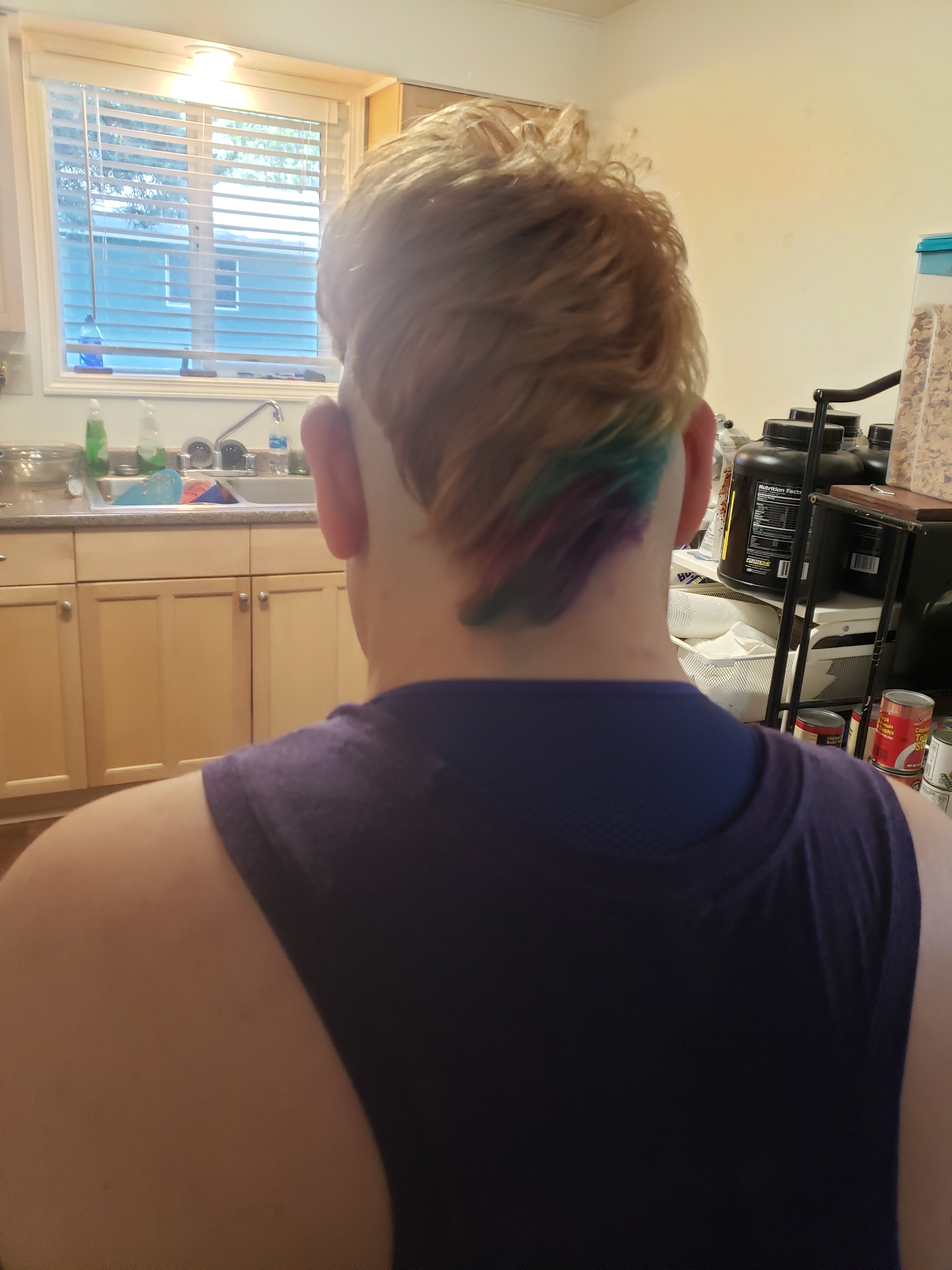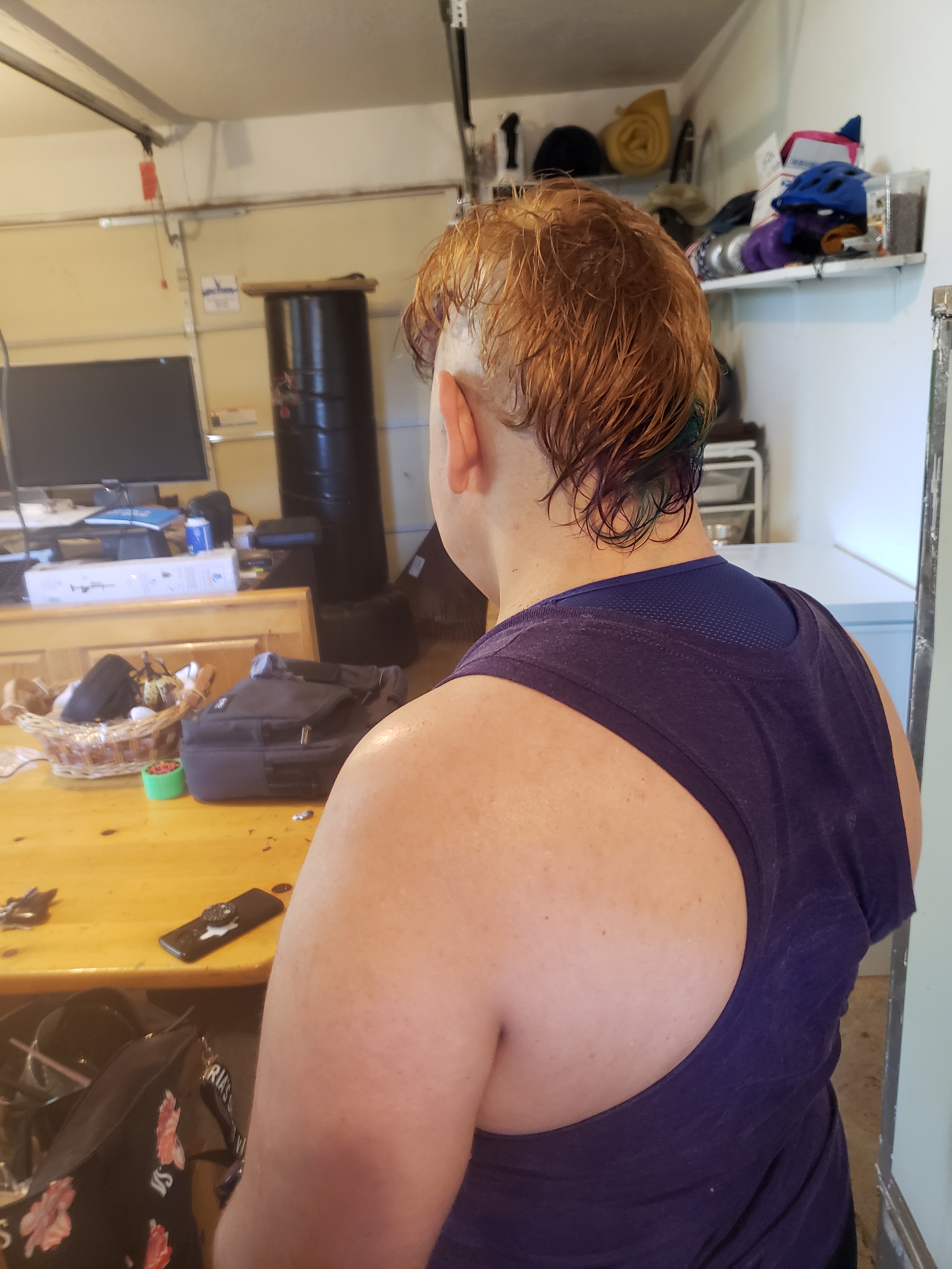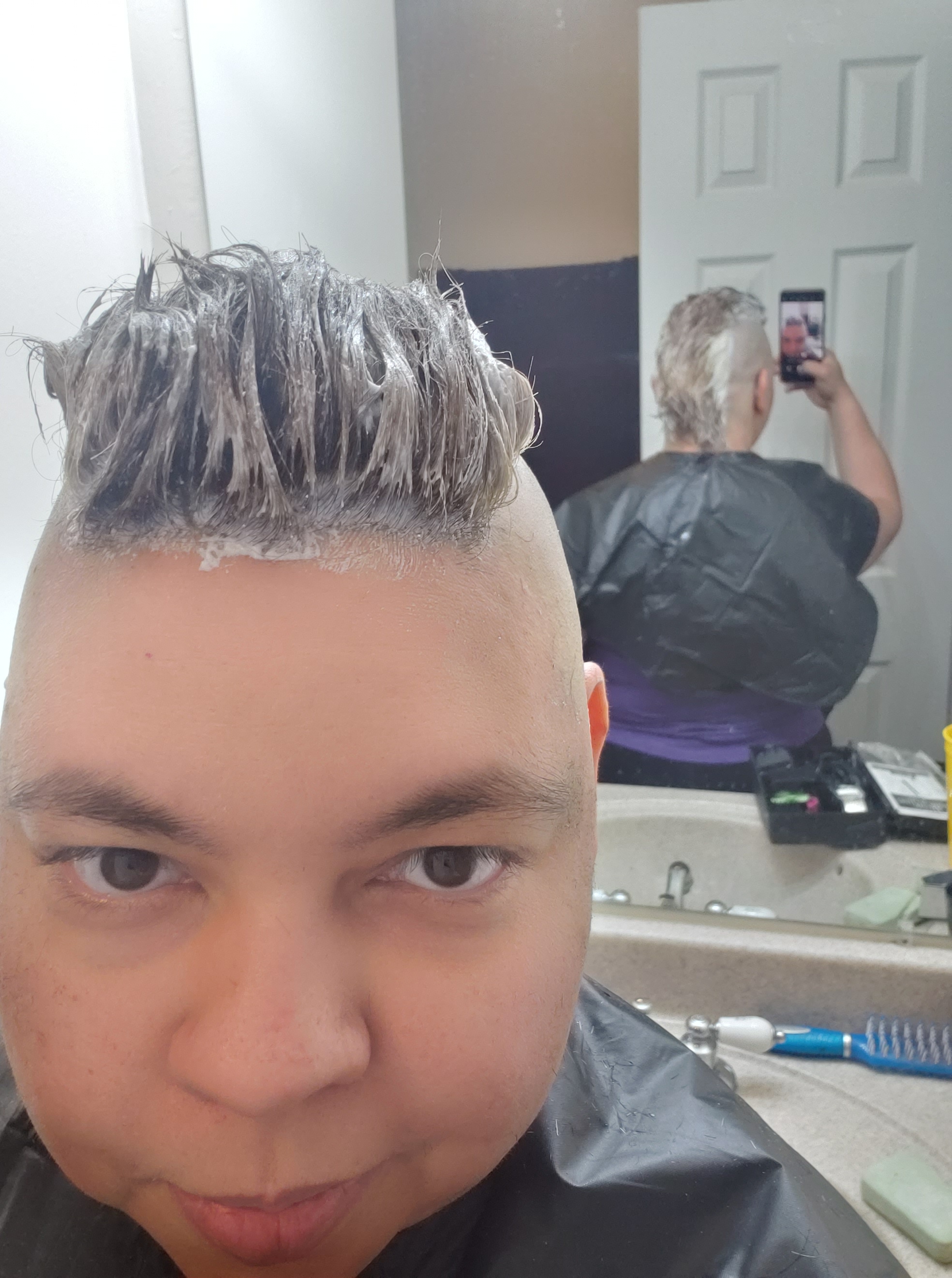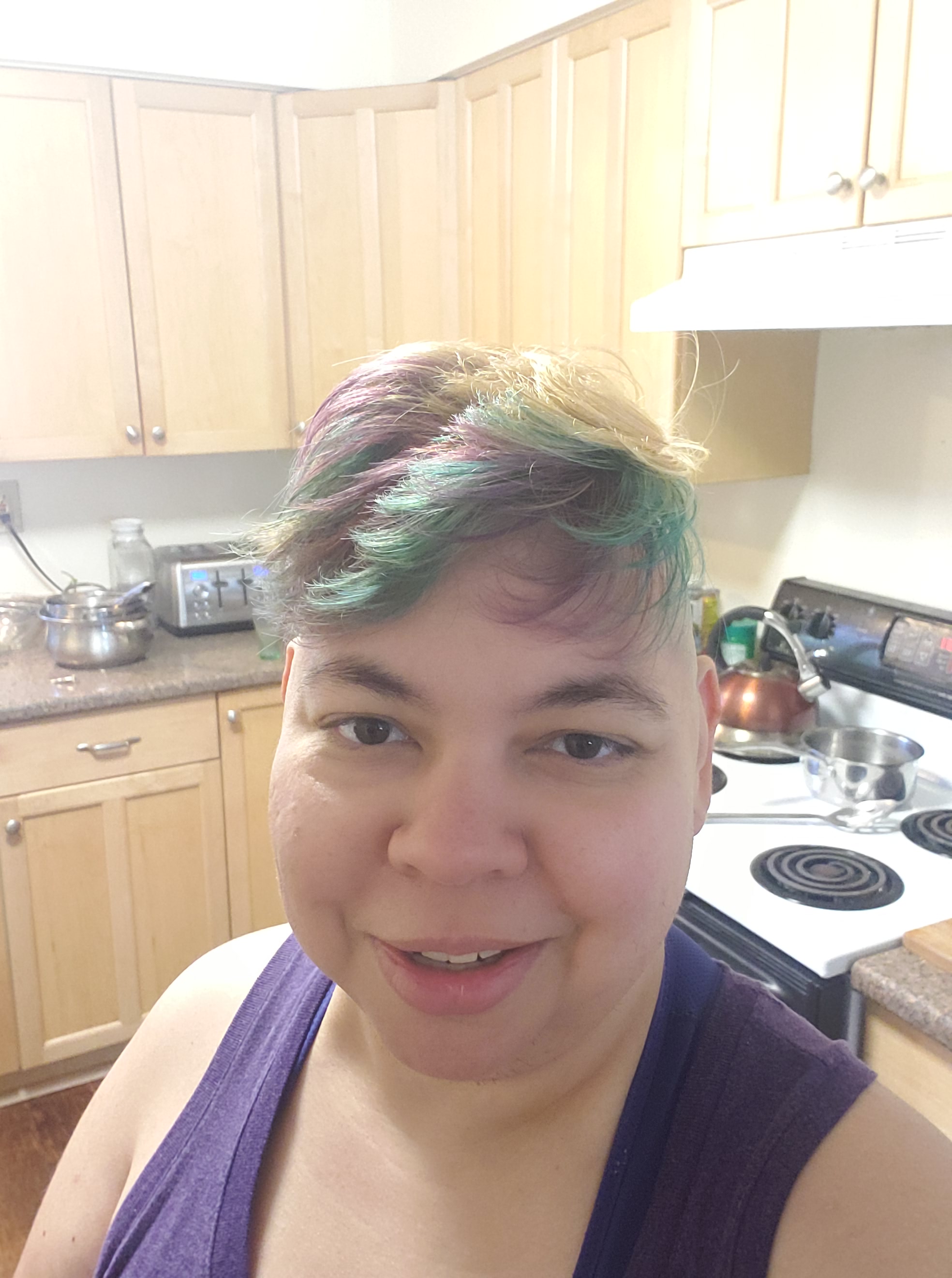 I stayed bald until I returned to Boise after briefly living in New York in 2016. I’ve tried various styles but I do prefer at least a partially bald head. Hence, the full on mohawk. After months of not cutting my hair, I finally had my favorite stylist over for a hair sesh. This time… along with getting my ‘hawk brought to point, I also went lighter with some galaxy colors for the summer. See the transformation below: